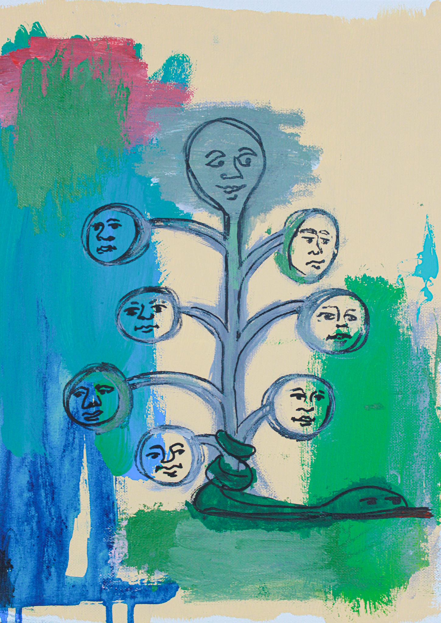 This painting visualizes the psyche as a branching system of identities. Multiple faces emerge from a single structure, representing different aspects of the self shaped by experience, memory, and inheritance. At the base, the snake symbolizes instinctual and unconscious energy, echoing the concept of Kundalini as a latent life force that rises upward, activating awareness as it moves through the psyche.