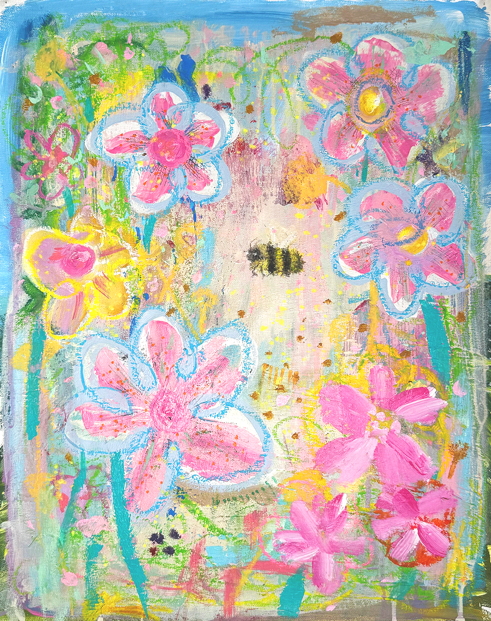 This painting depicts a solitary bumblebee in an expansive field of flowers. Rather than appearing lost or melancholic, the bee is fully absorbed in its own rhythm, moving freely and with ease. With no competition, the field becomes an unexpected abundance, a quiet jackpot earned through solitude.
